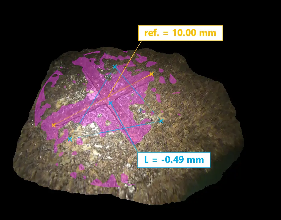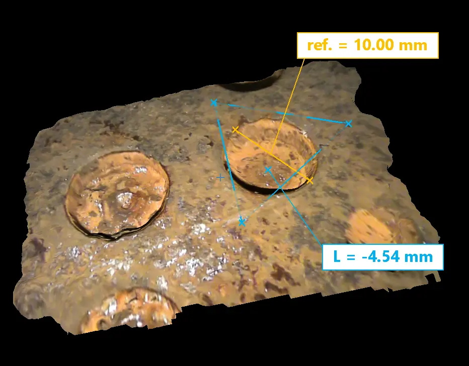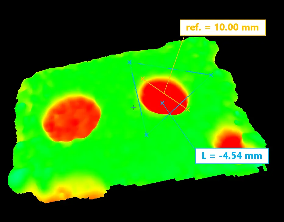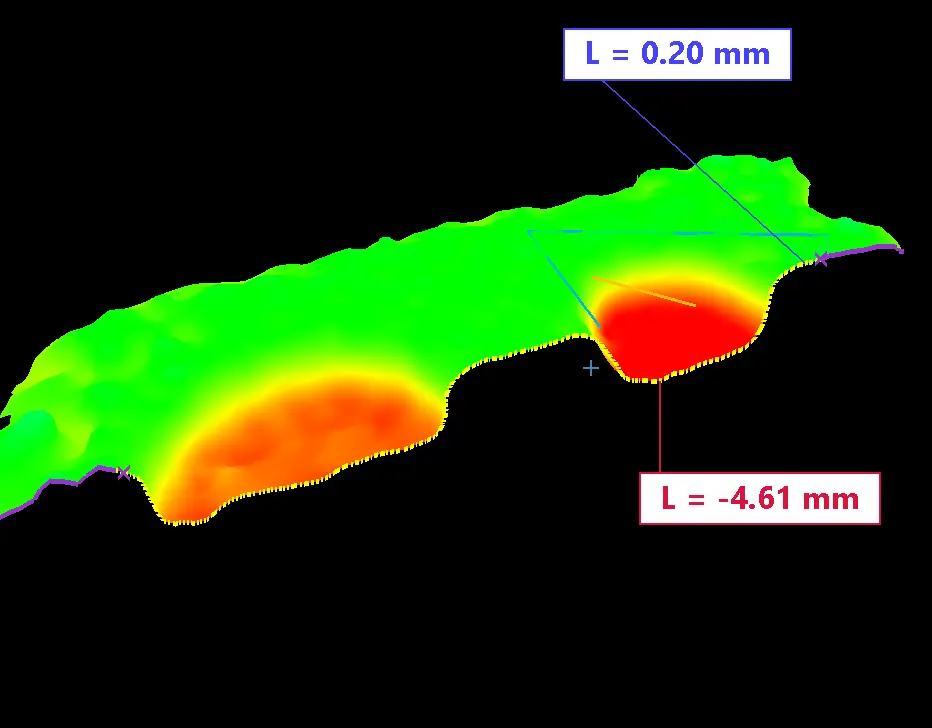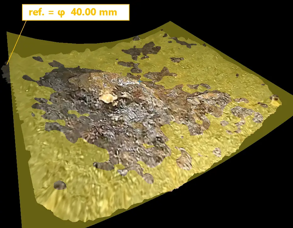 Inclua imagens 3D totalmente rotacionáveis nos relatórios e agregue dados quantitativos (altura, profundidade, perfis, etc.), aumentando a confiança na interpretação de defeitos como corrosão, desgaste e deformações.